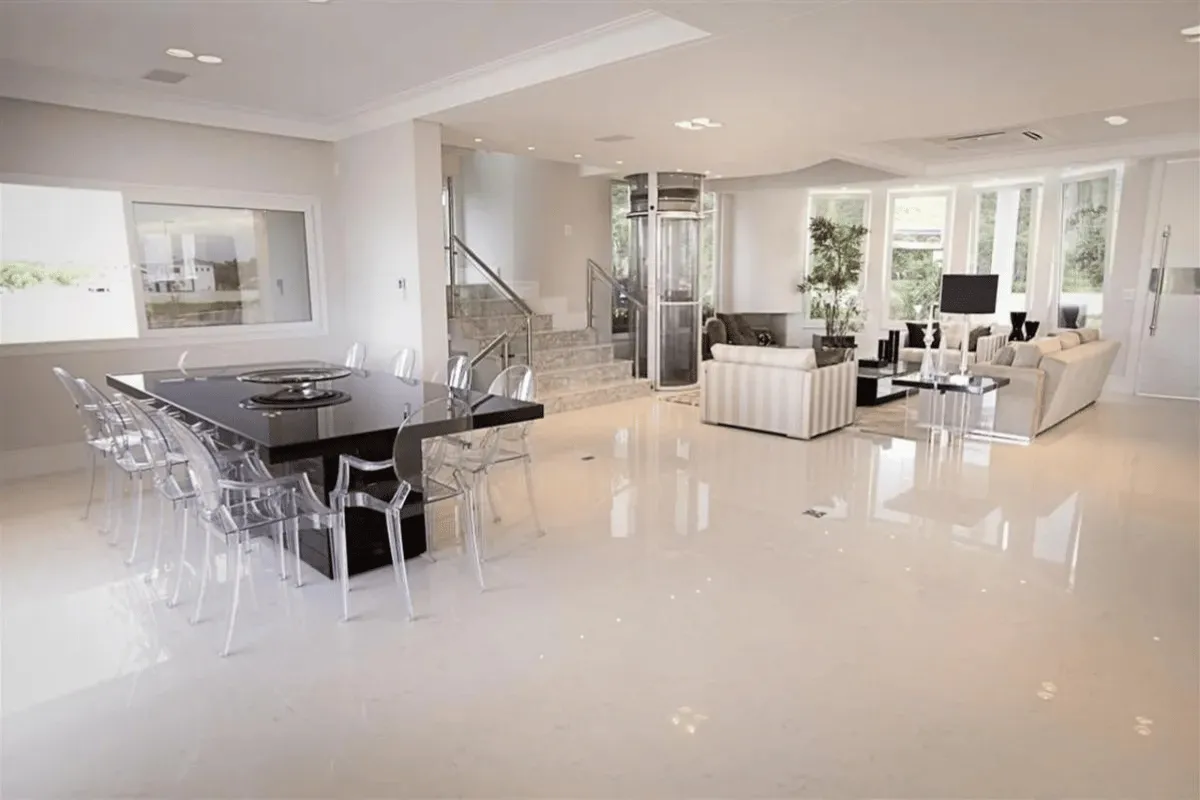 Condomínio exclusivo com áreas comuns revestidas em porcelanato requintado."