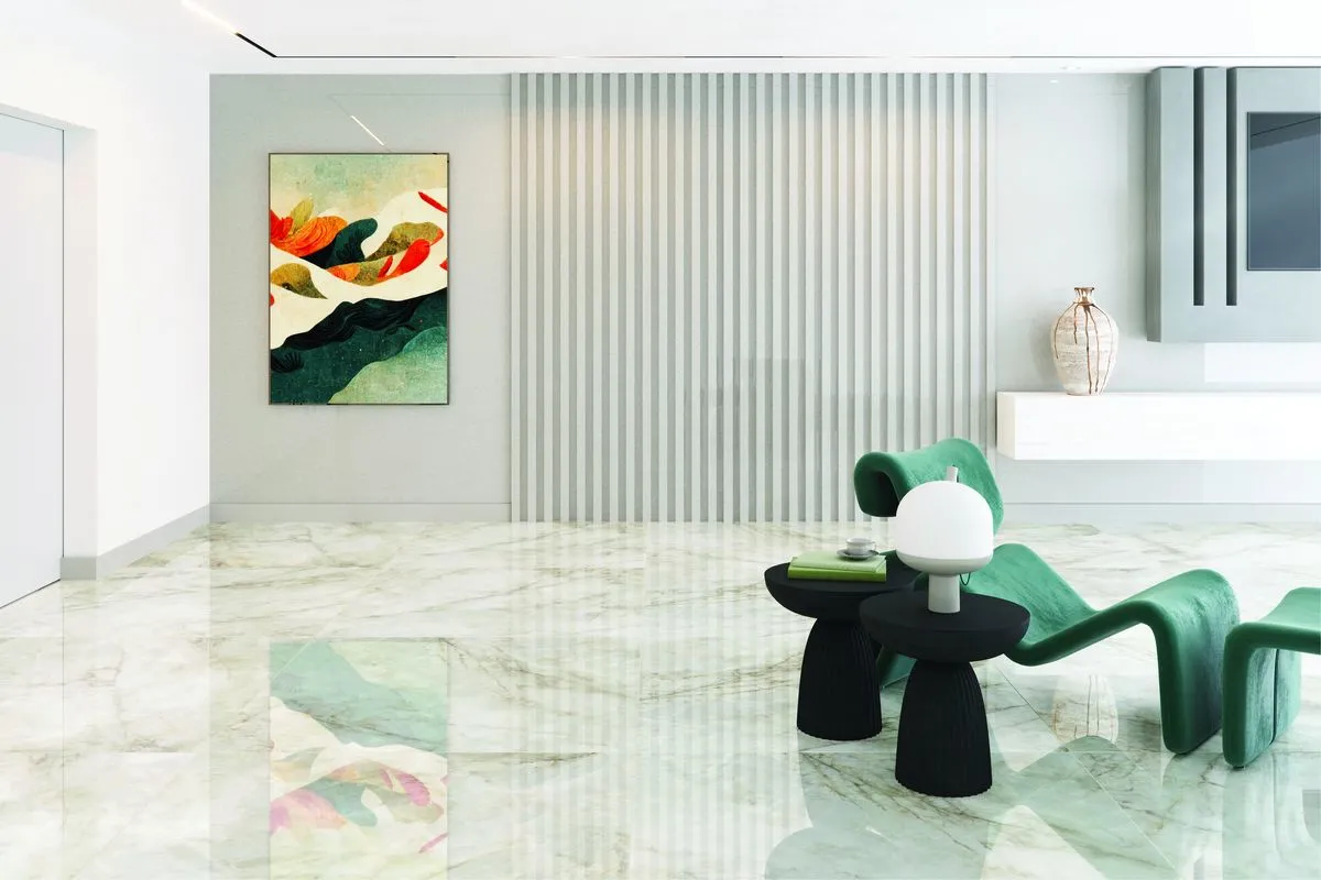 Condomínio exclusivo com áreas comuns revestidas em porcelanato requintado."